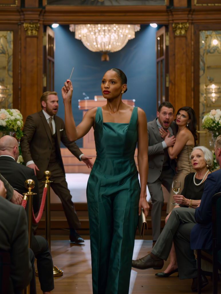 Three months to the day after her exile, Vanessa walked into the auction hall through the back entrance, not because she was hiding but because she didn’t need the attention of a grand entrance. She wore a satin emerald green jumpsuit, hair slicked into a bun, gold earrings catching light with each step. She looked like a woman who’d stopped asking permission to exist.