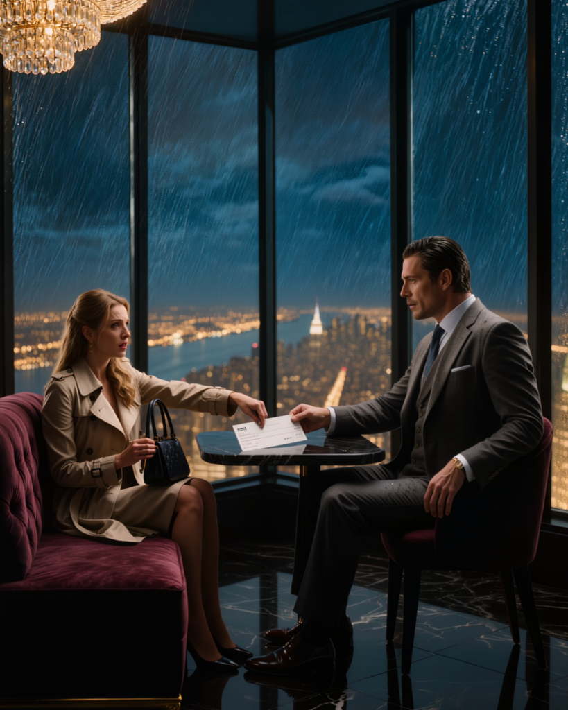 Julian led me into a private corner room with a panoramic view. Rain streaked down the glass like the skyline was crying. He gestured at a velvet sofa.