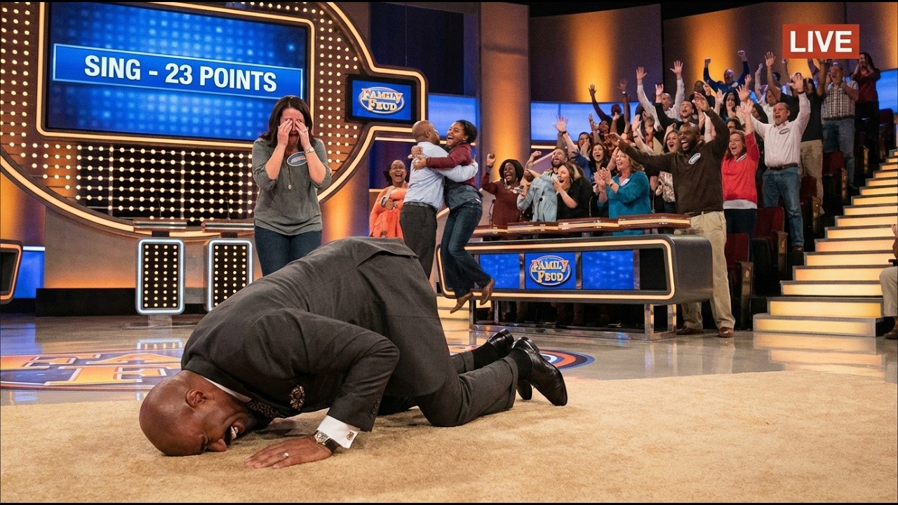 Steve Harvey’s body reacted before his mind did. His knees buckled like the floor had vanished, and he dropped down in a way that would’ve looked dramatic if it wasn’t so real. His cards went flying again. He slapped the stage with his palm like he was trying to wake himself up.