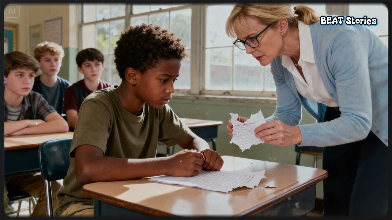 Mrs. Patricia Whitmore did not hesitate. She stood over ten-year-old Lucas Hughes, grabbed his neatly written assignment, and ripped it straight down the middle. Then again. And again. White paper fluttered to the floor like snow, landing on Lucas’s worn sneakers.
