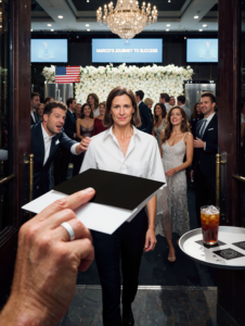 He took a step closer, grip clamping around my arm like a warning. Tight enough to bruise later. “You think you can just show up and be important? Like you’re part of this?” He gestured at the chandeliers, the screens, the slideshow titled MARCO’S JOURNEY TO SUCCESS.