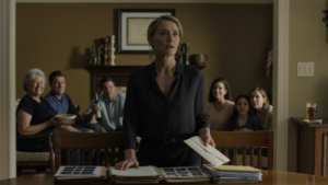 Sometimes at night, after everything has settled, I sit at the wooden kitchen table with a sealed envelope in my hands—not because I’m waiting for another threat, but because that’s where I now sort all the things that are mine. Tax notices. seed packets. insurance renewals. utility bills. Ordinary papers. I sit there in my dark sweater with my sleeves pushed up and the lamp warming the room, while Daphne stands at the counter rinsing vegetables or stirring something on the stove when she drops by, and the family photos on the shelf catch the same amber light as the little folded flag beside them. The room feels lived in now, not watched. Even the rings left by iced tea on paper coasters feel like proof of life instead of carelessness.