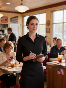 The Oakwood Grill smelled like maple syrup, fryer heat, and panic—the kind of brunch chaos that sticks to your clothes even after you shower. The host stand was swarmed, the espresso machine was screaming, and someone’s toddler was already crying like a tiny siren. A U.S. flag magnet held the week’s schedule on the steel fridge by the server station, and an old speaker in the corner kept trying to play Sinatra through the clatter, like the restaurant wanted to pretend it was classy.