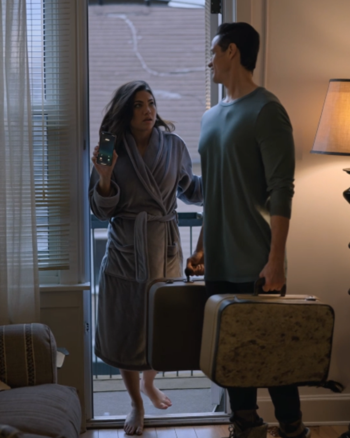 He answered by stepping forward. Not around me—through me. His shoulder brushed mine like I was a coat rack in his way. He dropped one suitcase onto my couch, the one I bought after months of overtime and too many “maybe next paycheck” nights. The second bag followed, thudding onto my armchair hard enough to knock my neatly stacked nursing journals onto the floor.