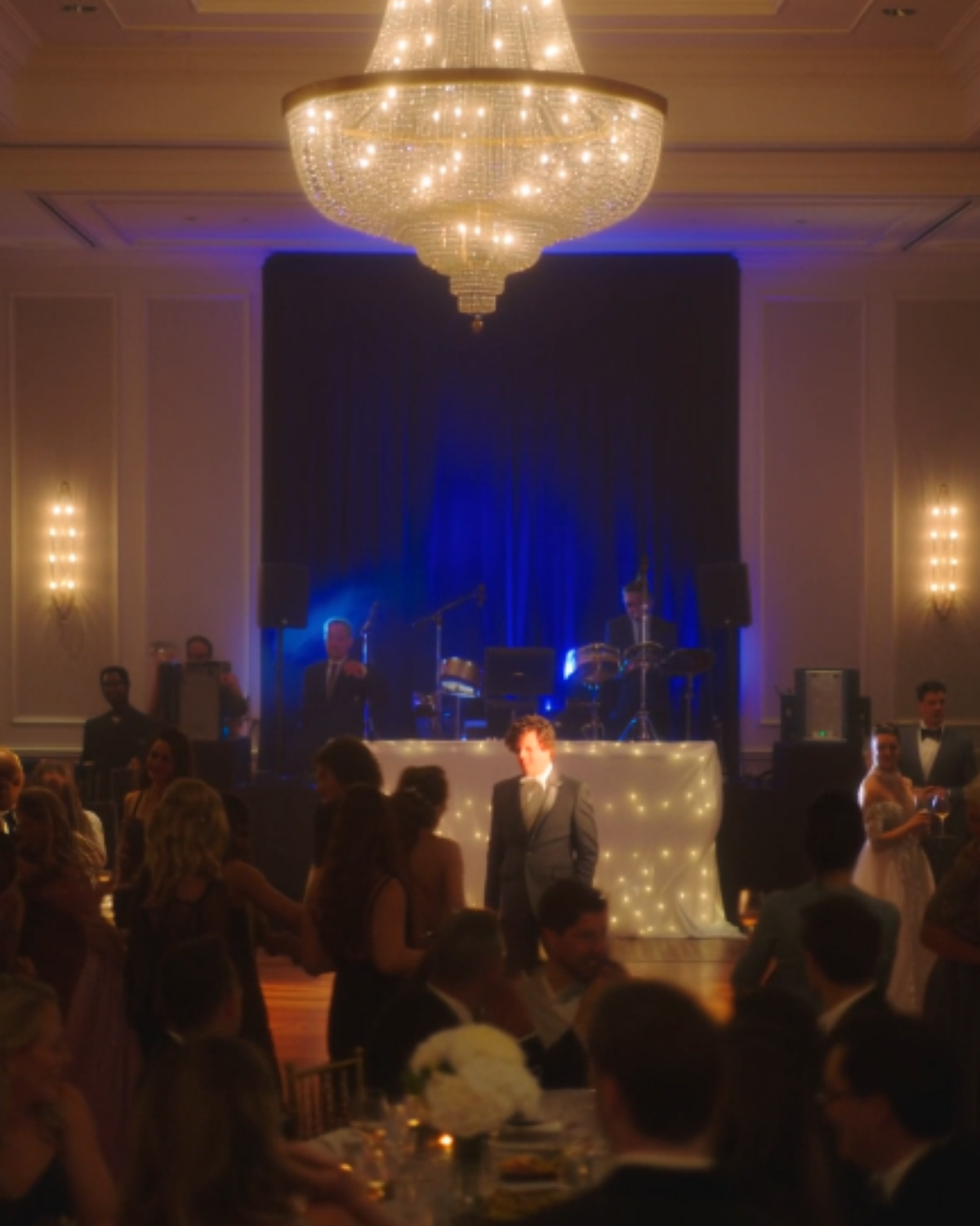 The ballroom was doing that expensive kind of dim—crystal chandeliers turned down low, candles pretending to be intimate, a jazz cover band trying to sound like Sinatra without committing to it. Somewhere near the dance floor, a waiter threaded through the crowd with a tray of sweet tea and bourbon like it was a peace offering. I stood by the bar with my jacket buttoned, a little enamel U.S. flag pin on my lapel that the hotel concierge had insisted was “patriotic” for the weekend package. It felt like a costume piece.