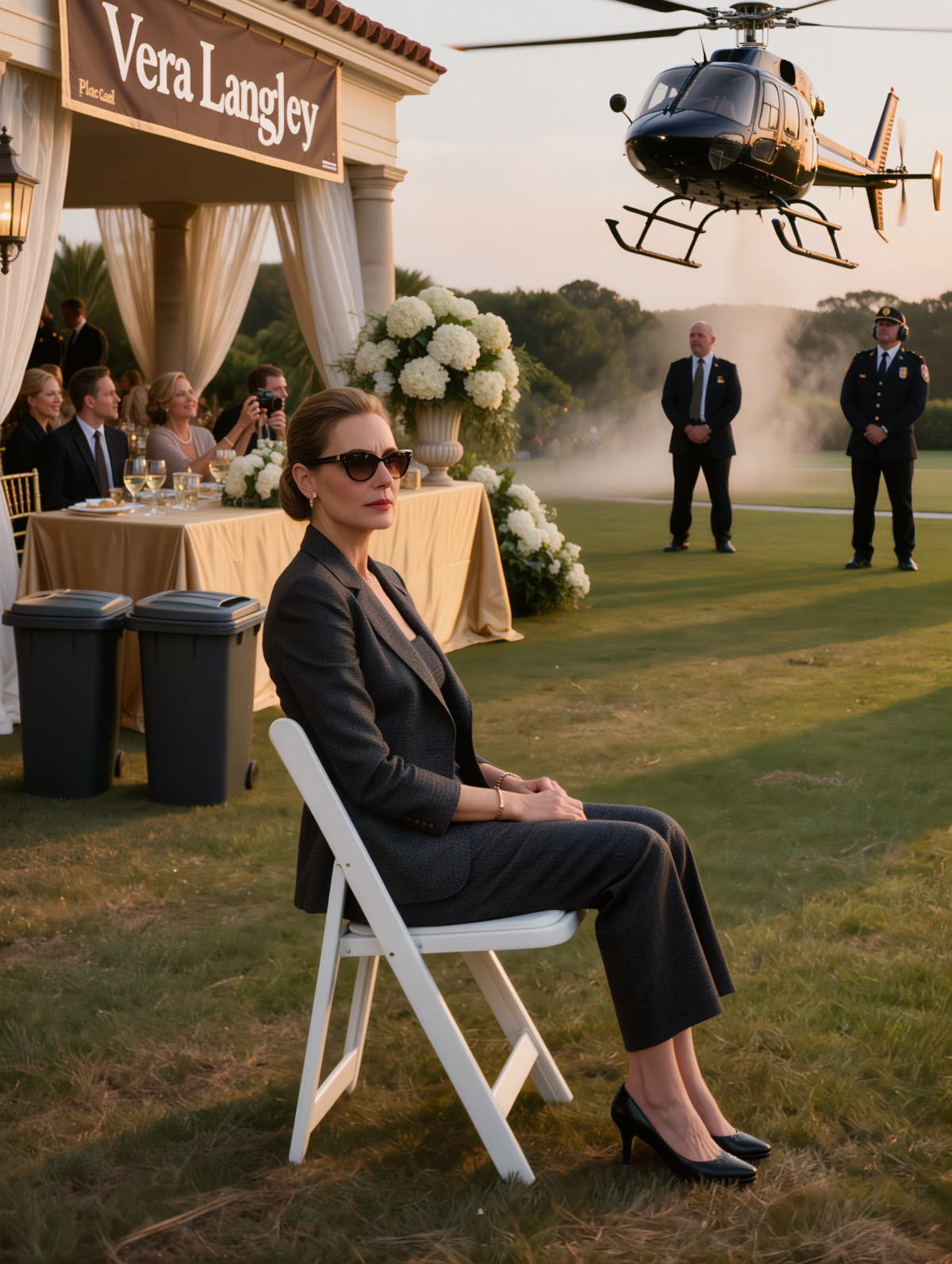 A sleek black helicopter appeared over the estate, rotor wash scattering napkins and whipping dresses into chaos. Staff rushed to hold down centerpieces. A flute slipped from someone’s hand and broke against the pavers.