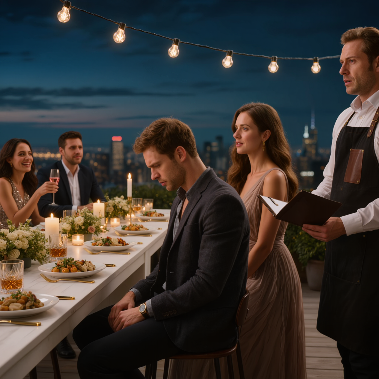 The dinner was at a rooftop venue downtown, one of those places where everything is “aesthetic.” Edison bulbs hanging like a Pinterest board. $25 cocktails with flower petals floating on top. A view designed for engagement photos.