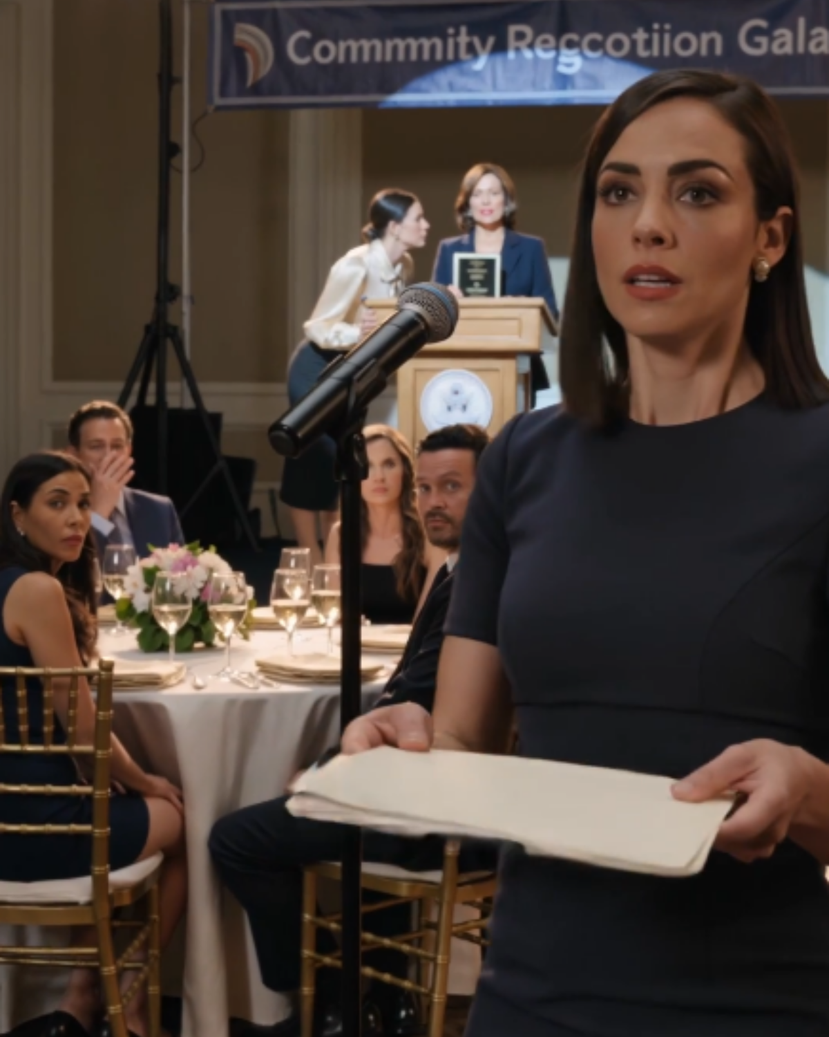 At the gala, I sat near the back with a folder on my lap—closed, calm, ready.