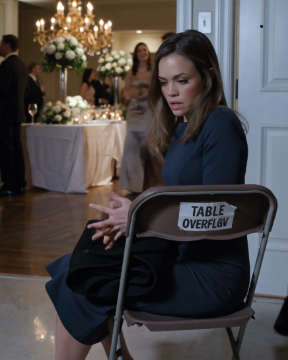 Three words in bold black print—TABLE OVERFLOW—tilted crookedly on the back of a metal folding chair, like someone had slapped a label on a box they didn’t plan to keep. A bridesmaid brushed past with a tray, the restroom door swung open, and a gust of cold air hit my knees as if the building itself was exhaling at me.