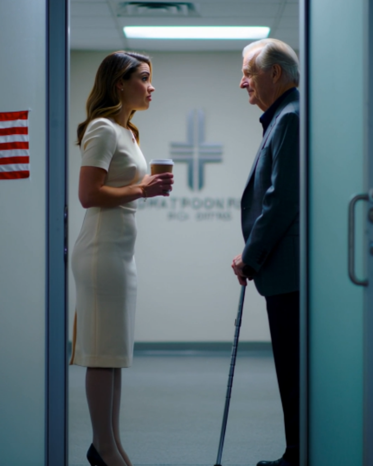It happened in our lobby under fluorescent lights that buzzed like they were in on the secret, with a dusty **{US flag}** sticker on the front door from some long-forgotten Fourth of July promo curling at the edges. An old man stood there, steadying himself on a cane, his blazer neat, his shoes polished, his smile warm enough to make strangers feel safe.