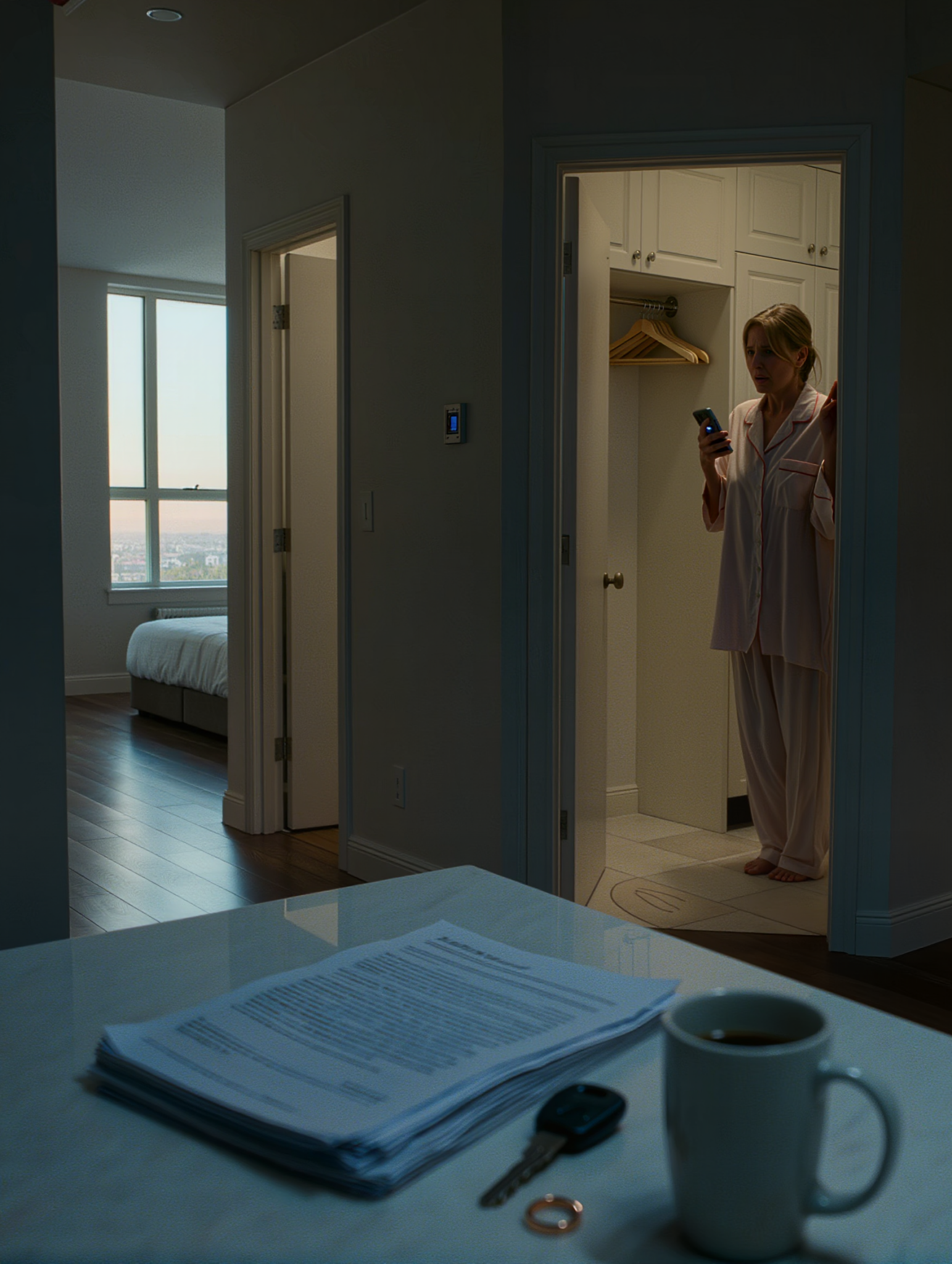 The brass skeleton key sat on the kitchen table like it was keeping watch, its teeth worn smooth from years of turning stubborn locks on stubborn doors. I’d brought it home from a courthouse restoration in Massachusetts—one of those little souvenirs you don’t buy, you just end up with after a foreman presses it into your palm and says, “Keep it. It’ll remind you what real doors feel like.” That morning, it rested on the corner of a neatly stacked packet of papers, holding them flat so the ceiling fan’s soft draft wouldn’t lift a page. Beside it was my wedding ring, plain gold, and a house key Allison would notice was missing from my keyring. A mug stained with yesterday’s coffee sat near the sink, and the local news murmured about a pileup on I-93 and a city council vote I didn’t care about. The whole apartment smelled faintly of lemon dish soap and the cedar paneling I’d refinished last winter. At 6:18 a.m., I zipped the last duffel bag, set it by the door, and listened to my wife breathe evenly in the bedroom like nothing in the world had changed.