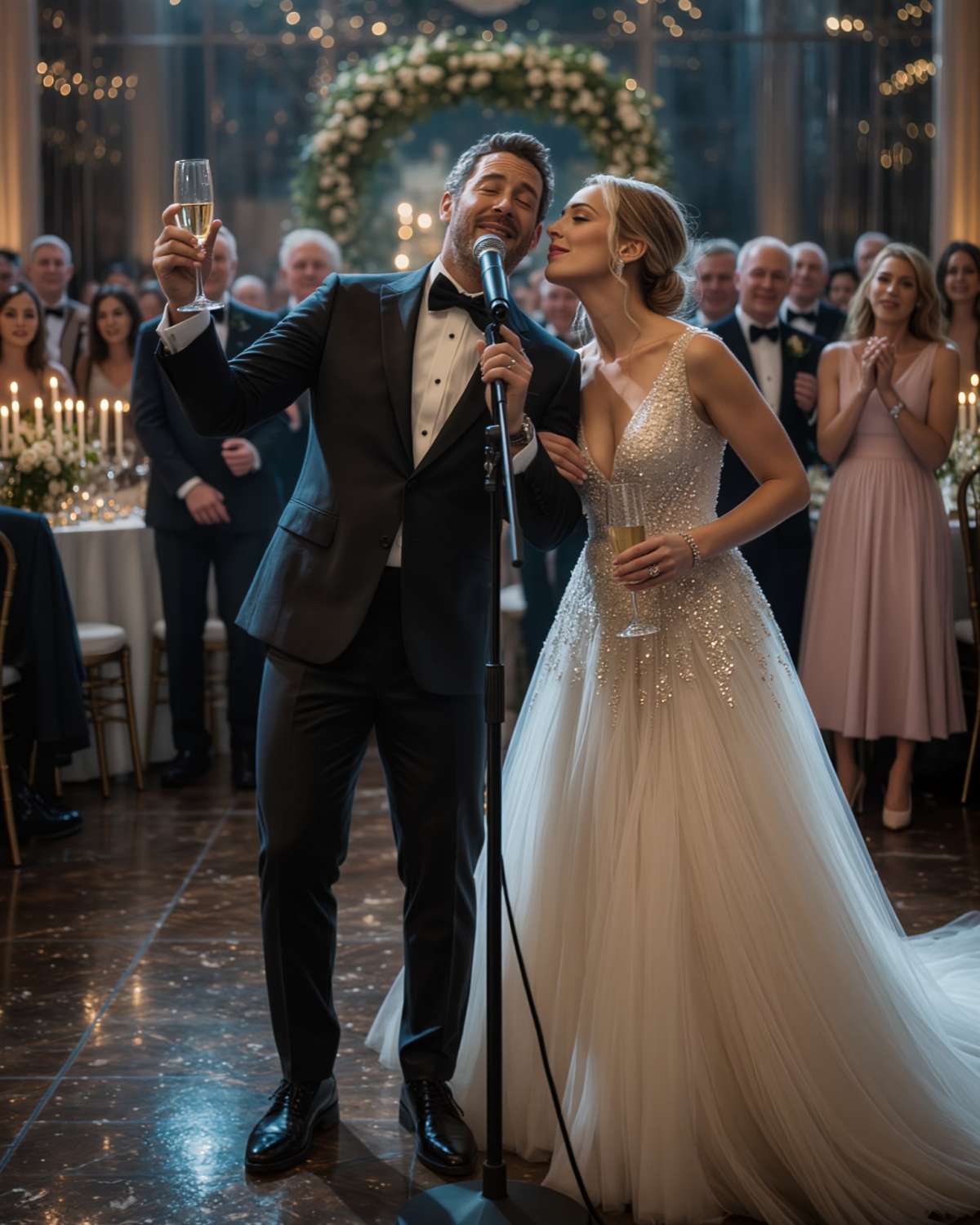 He stepped forward, took the microphone, and lifted his glass like he was the hero of a love story.