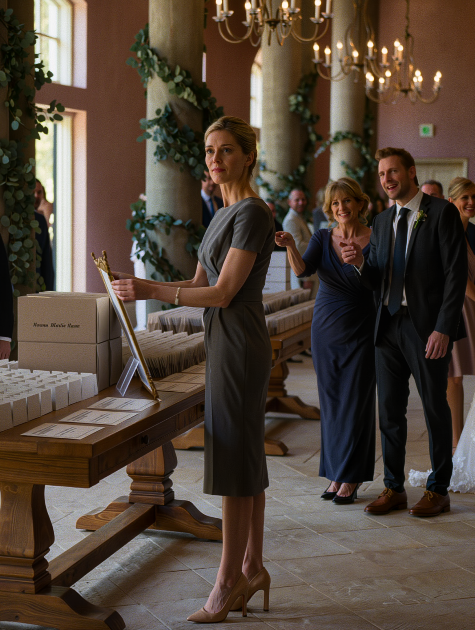 At the venue the morning of the wedding, I arrived early on purpose—before guests, before cameras—so I could place my work exactly where it belonged. I wore slate gray, nude heels, no jewelry. Not to stand out. Just to look like someone who had every right to be there.
