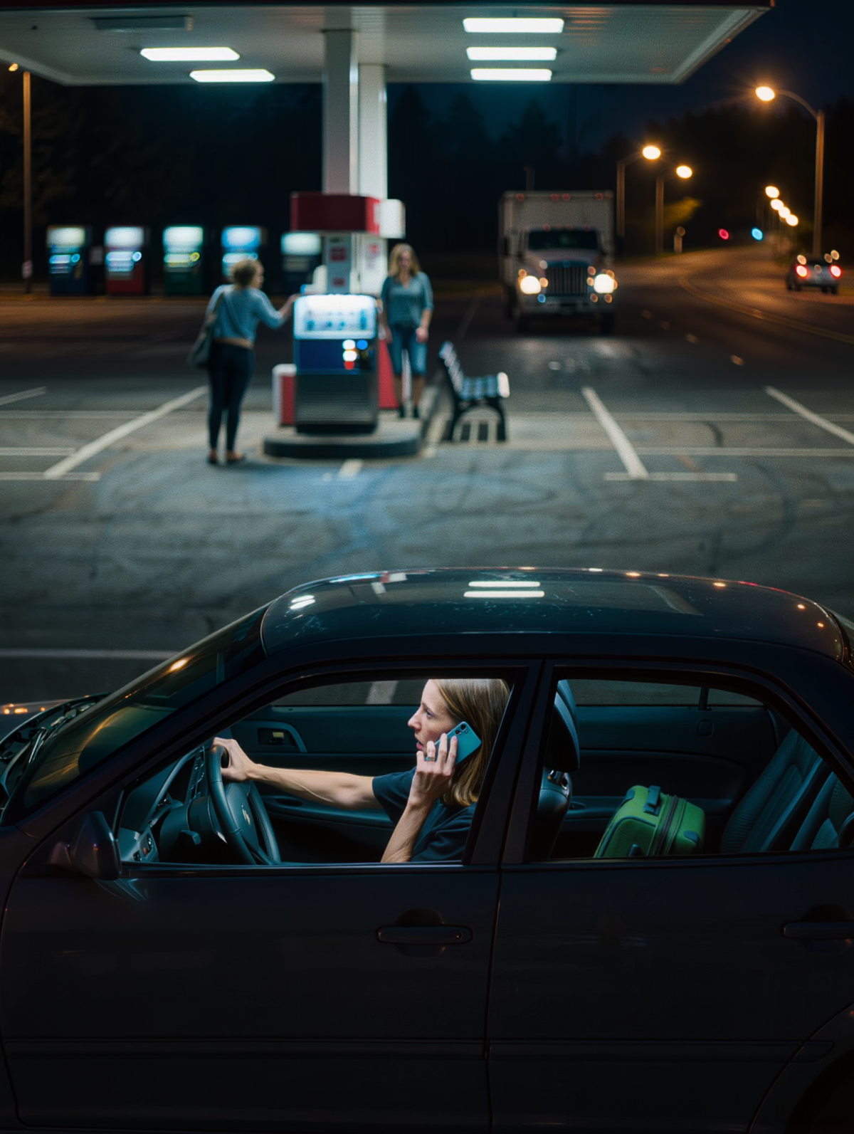 The gas station on the edge of town still had one of those faded little American flag magnets slapped onto the coffee machine—crooked, sun-bleached, like it had been there since the first Bush administration. A tinny Sinatra song leaked out of the ceiling speaker and fought a losing battle with the buzz of the overhead lights. I sat in my car with a warm cup of iced tea sweating in the holder, my suitcase thumping softly in the back every time a semi rolled past, and my house key lying in my palm like it weighed a pound.