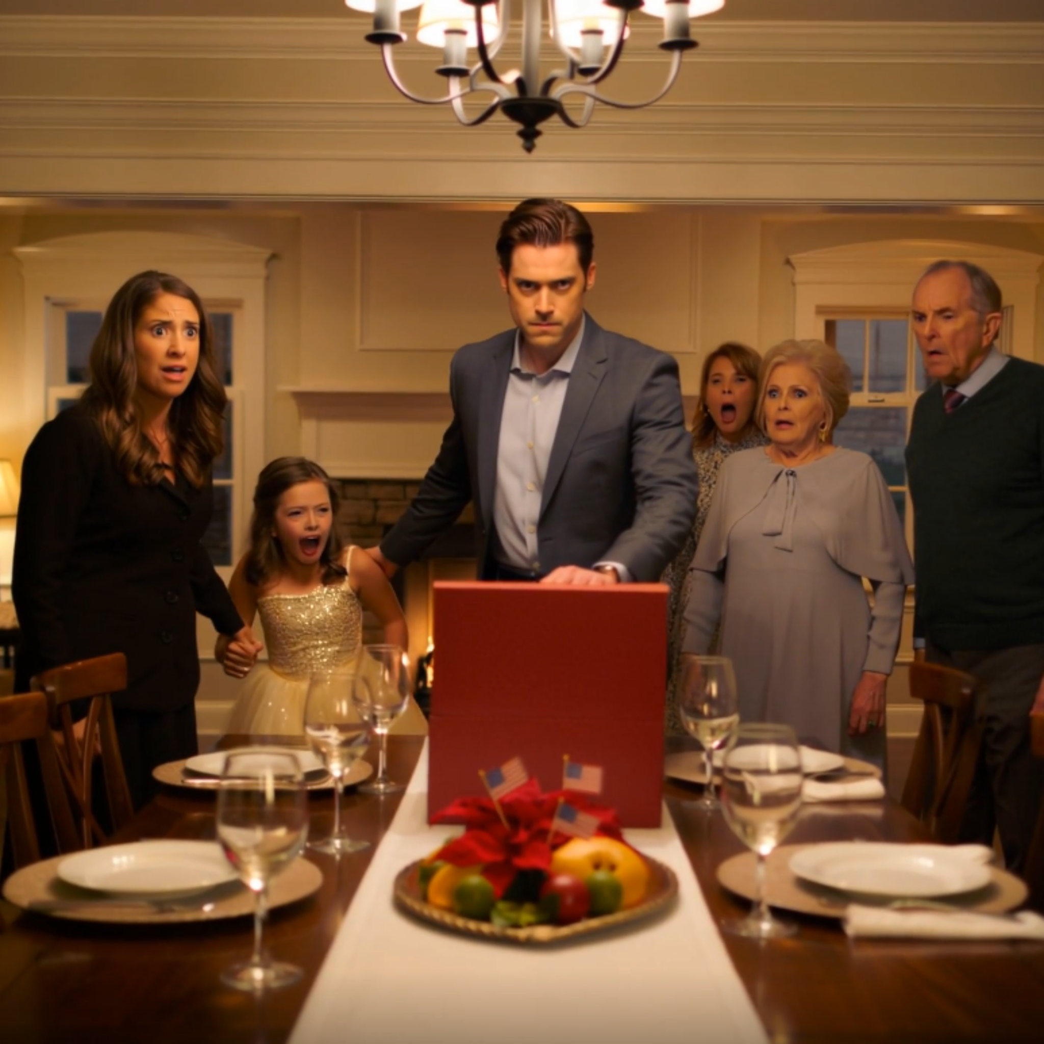 Lorraine’s dining room was packed shoulder-to-shoulder—holiday sweaters, clinking glasses, the soft croon of Sinatra coming from a Bluetooth speaker someone had hidden behind a poinsettia. My seven-year-old stood at the end of the table in the sparkly gold dress she picked out herself, curls done twice because she insisted it mattered. She was so small beside all that adult noise, gripping a tiny red gift box with both hands like it was heavier than it looked.