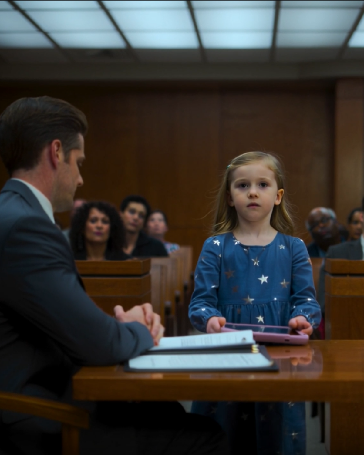 The courthouse smelled like lemon disinfectant and old paper, the kind of “clean” that never feels comforting. A vending machine hummed in the hallway outside Courtroom 4B, and somewhere near the ceiling, an AC vent clicked like it was counting down to something. Phoenix stood beside me in her **blue dress with silver stars**, clutching her **pink tablet with the purple butterfly case** so tightly her knuckles went pale.